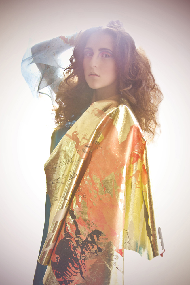 Shauna has created a screen-printed cape inspired by the work of F.E McWilliams'. Pushing the barriers of print into the 3 dimension, she wanted to create a piece that would change shape and form when worn and in motion. The surface design reflects the silhouettes and form and the suggestion of movement that is alive within F.E McWilliams' work. Women of Belfast, the expressive works that capture the fragility of life, particularly inspired Shauna. As F.E McWilliams' work was so driven by movement, Shauna was inspired by the idea of creating a piece of art which could then become variable when worn, communicating the idea in motion.